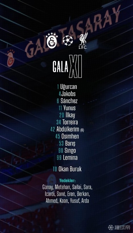 加拉塔萨雷首发:1-恰基尔、4-雅各布斯、42-巴尔达奇克、6-达文森-桑切斯、90-辛戈、99-勒米纳、34-托雷拉、11-阿克金、20-京多安、53-伊尔马兹、49-奥斯梅恩