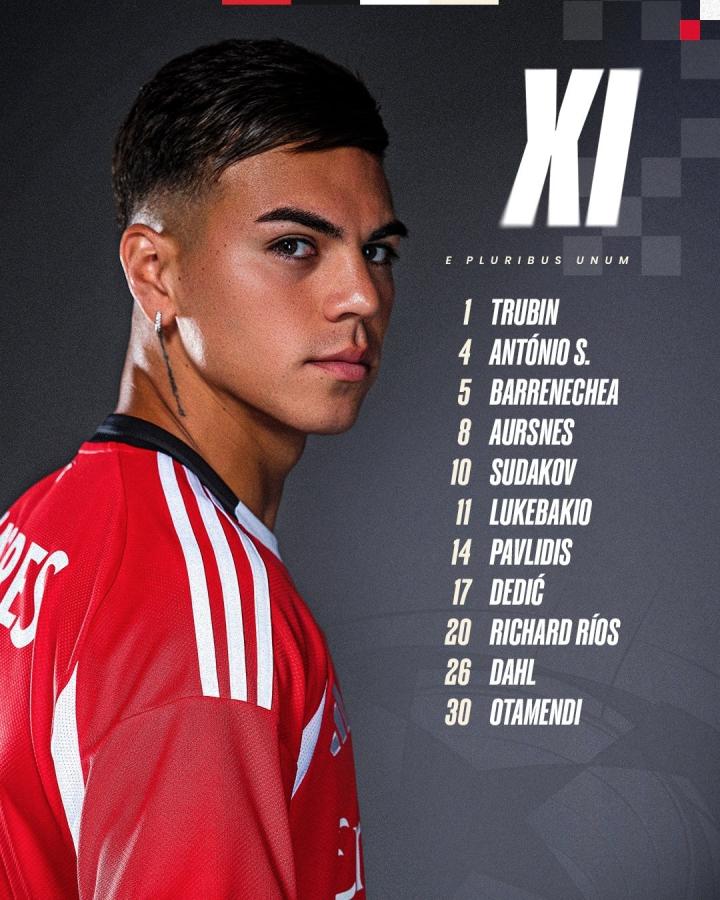 本菲卡首发:1-特鲁宾、26-达尔、30-奥塔门迪、4-席尔瓦、17-德迪奇、8-奥尔斯内斯、5-巴雷内切亚、20-里奥斯、10-苏达科夫、14-帕夫利季斯、11-卢克巴吉奥