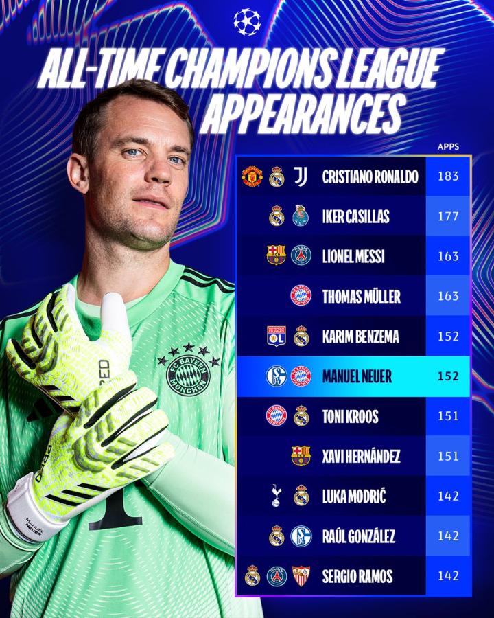 欧冠联赛阶段第二轮,拜仁客场5-1大胜帕福斯,此役首发出战的门将诺伊尔以152次出场追平本泽马,升至欧冠正赛历史出场榜第五位。