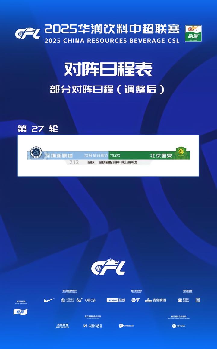 根据2025华润饮料中超联赛赛程,深圳新鹏城对阵北京国安的比赛将于10月17日20:00在深圳市体育中心体育场进行,因深圳赛区举办第十五届全运会足球男子U18比赛,为保证本场比赛安全有序进行。经深圳新鹏城足球俱乐部申请,协商深圳赛区、北京国安足球俱乐部以及有关方面同意,现决定将深圳新鹏城对阵北京国安比赛进行调整,具体调整如图。(完)