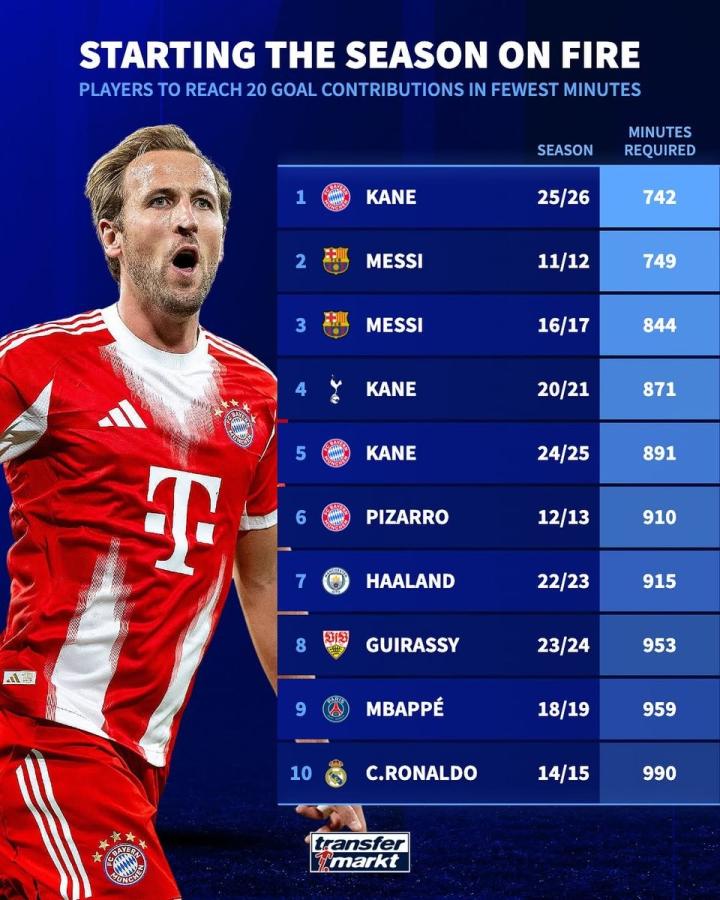 凯恩本赛季代表拜仁在各项赛事出场742分钟已直接参与20球,包括17球3助。据德国转会市场网站统计,凯恩是参与赛季前20球所用时间最少的球员。