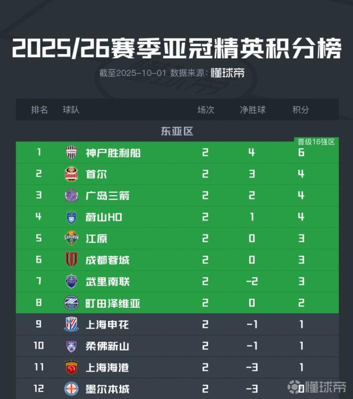晋级区方面,日本球队神户胜利船两战全胜排名第1,首尔、广岛三箭、蔚山HD均积4分排在2-4名,江原、蓉城、武里南联积3分排在5-7名,町田泽维亚积2分排在晋级区末位。