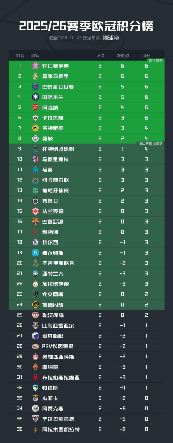 北京时间10月2日,2025/26赛季欧冠联赛阶段结束了第2轮的全部争夺。