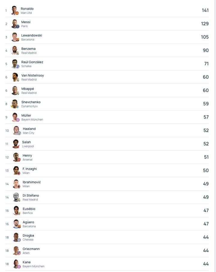 欧冠联赛阶段第二轮战罢,在欧冠历史射手榜上,姆巴佩升至第六,哈兰德升至第十,凯恩升至第十八。