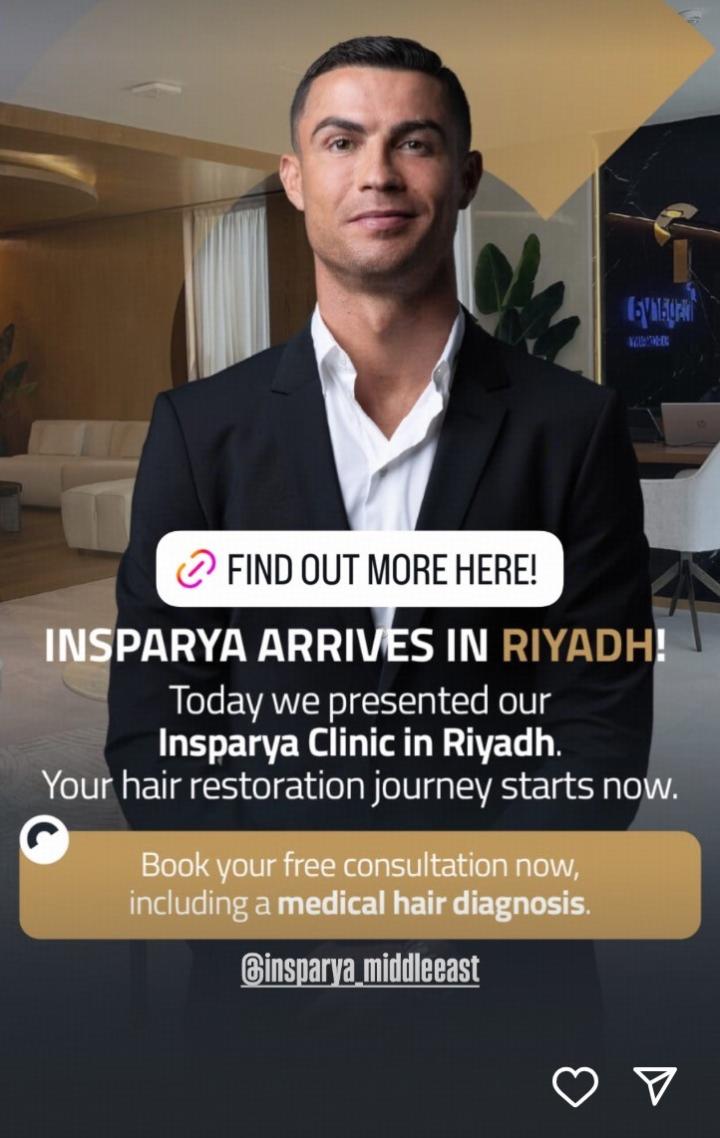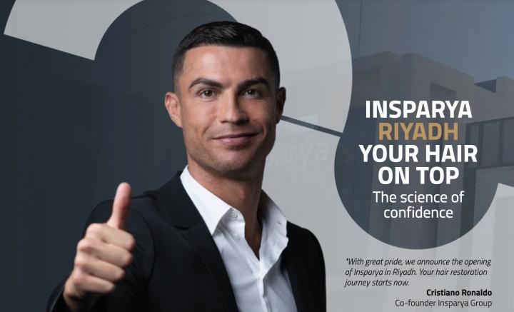 C罗在品牌宣传中写道:“我们非常荣幸地宣布Insparya诊所在利雅得开业。您的头发修复之旅从现在开始。”