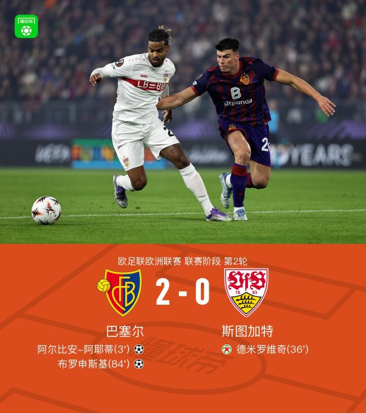 巴塞尔2-0斯图加特,阿耶蒂、布罗申斯基破门,德米罗维奇失点