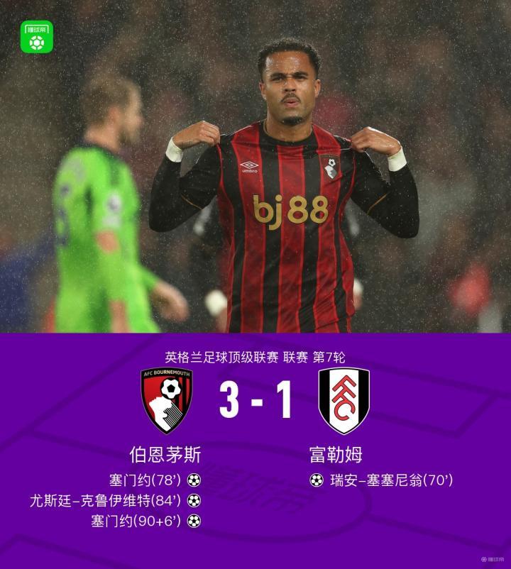 伯恩茅斯3-1逆转富勒姆,塞门约双响,尤斯廷-克鲁伊维特破门