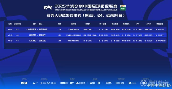 北京时间10月4日,中超第23、24、26轮补赛裁判名单公布,塔基执法梅州客家vs青岛海牛,马宁担任VAR。