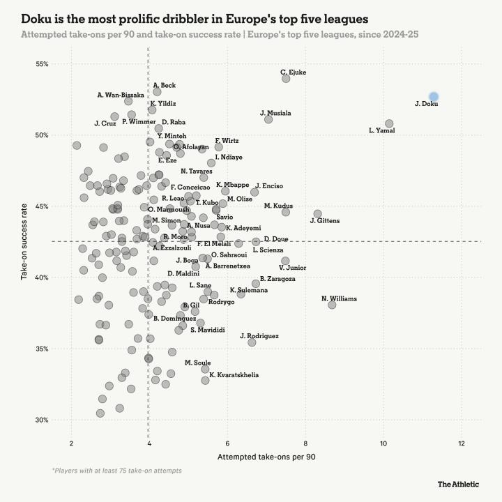 自上赛季开始以来,在欧洲五大联赛中,在所有完成超过75次成功过人的球员里,没有人的场均尝试过人次数(每90分钟11.3次)或成功过人次数(每90分钟6次)比多库更多。