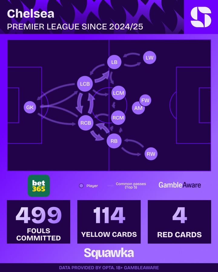 数据显示,自2024-25赛季至今,切尔西已成为联赛中得牌最多的球队。