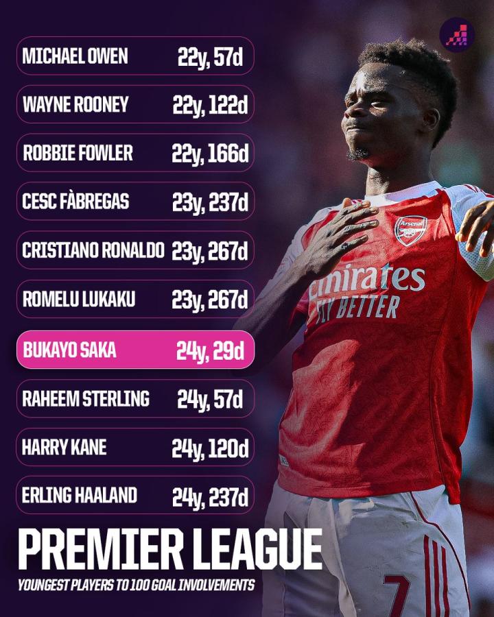 在与西汉姆联的比赛中,萨卡打入一球,达成英超生涯参与100球里程碑(55球45助),据统计,24岁29天的萨卡是英超历史上参与100球第七年轻的球员。