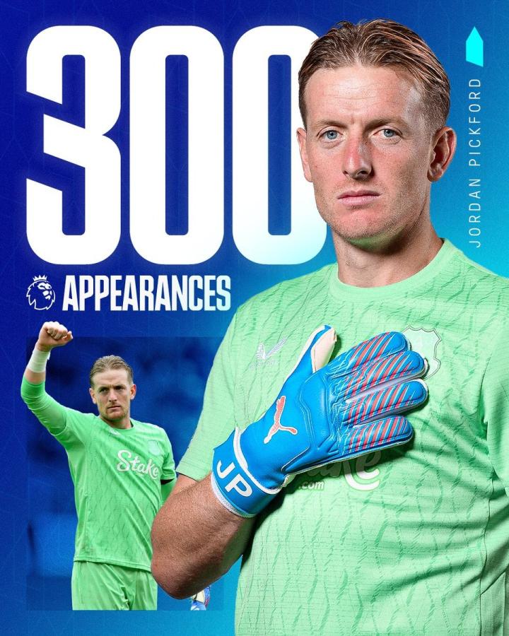 此役主场对阵水晶宫,皮克福德首发出战,这位英格兰门将迎来代表埃弗顿在英超赛场的第300次出场。