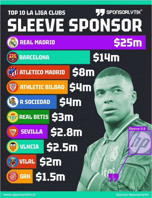 根据Sponsorlytix的一项研究,西甲当中有17家俱乐部通过球衣袖标赞助获得了收入,而合同金额最高的10支西甲球队总金额达到6680万美元。