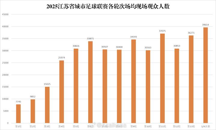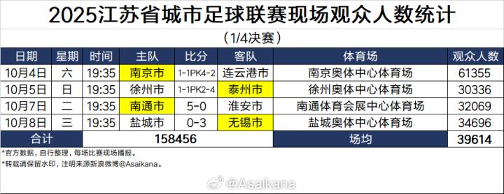 据德转亚洲区管理员朱艺@Asaikana 的消息,苏超1/4决赛4场比赛超15万人现场观战。
