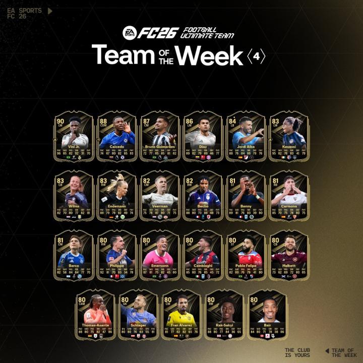 EA官方公布了第四周的周黑,其中,维尼修斯、凯塞多、路易斯-迪亚斯、博尼在列。