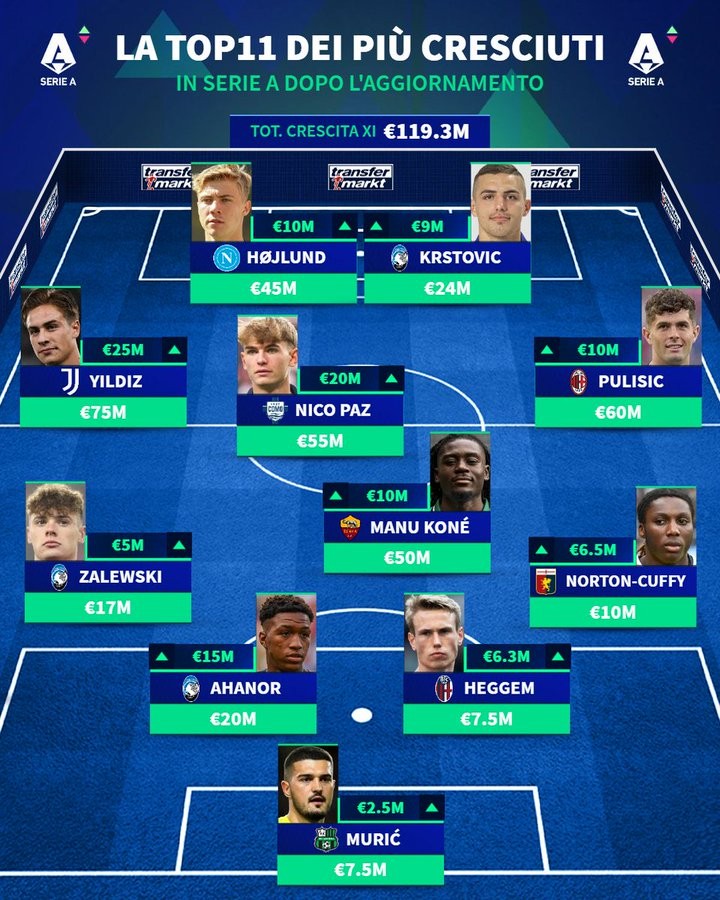 北京时间10月9日,在更新了意甲球员的身价之后,德转还列出了此次身价上涨幅度最高的11人阵容,霍伊伦、凯南-伊尔迪兹、尼科-帕斯、普利希奇、夸迪奥-科内以及扎莱夫斯基入选。