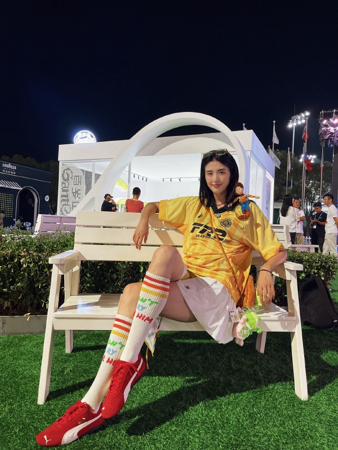 一个小巧的挎包上同样也是动漫的玩偶,下身则是球鞋运动袜配上白色的短裙,这样的搭配显得她活力满满又可爱大方,依旧是少女心爆棚。