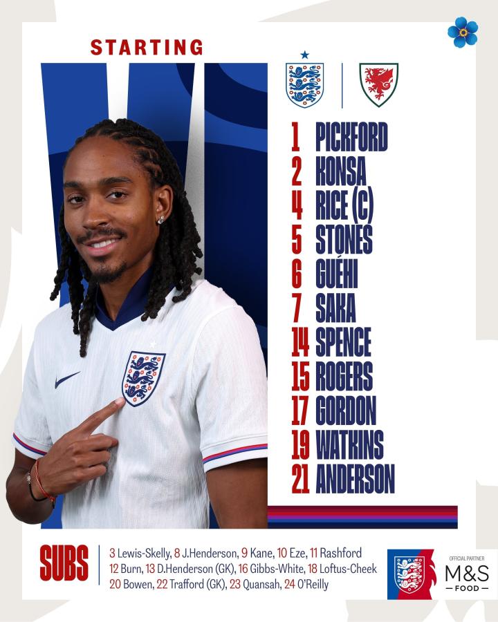 英格兰首发:1-皮克福德、2-孔萨、4-赖斯、5-斯通斯、6-格伊、7-萨卡、14-斯彭斯、15-罗杰斯、17-戈登、19-沃特金斯、21-安德森