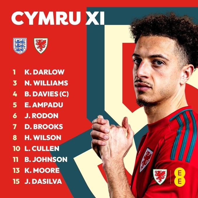 威尔士首发:1-达洛、3-威廉斯、4-戴维斯、5-艾姆帕杜、6-罗顿、7-布鲁克斯、8-威尔逊、10-卡伦、11-约翰逊、13-穆尔、15-达席尔瓦