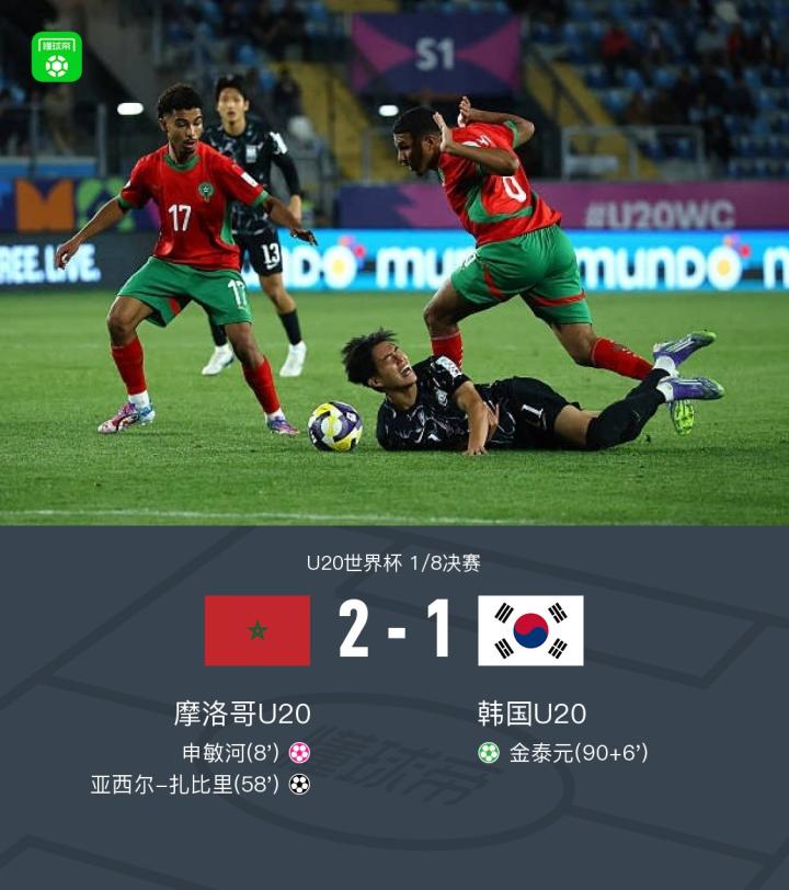 摩洛哥U20 2-1韩国U20闯进下一阶段,扎比里破门+造乌龙