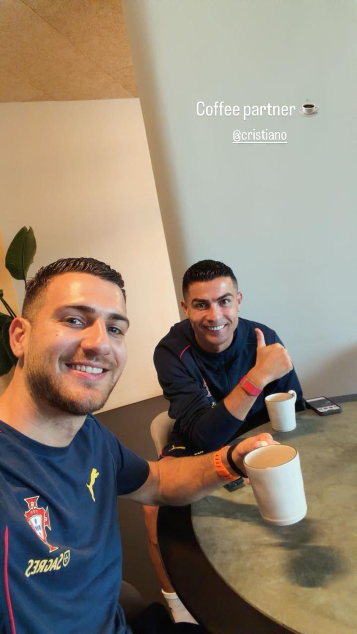 10月10日,在葡萄牙国家队集训期间,达洛特在社交媒体晒出他和C罗一起喝咖啡放松的自拍合照。
