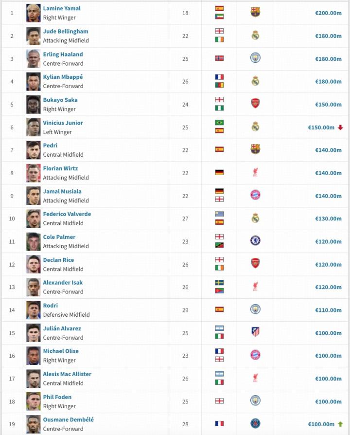 随着登贝莱身价登上1亿欧,在德国转会市场身价榜上,目前有19名球员身价过亿,五大联赛中仅意甲没有球员上榜。德甲身价将在10月14日更新,英超身价在10月17日更新。