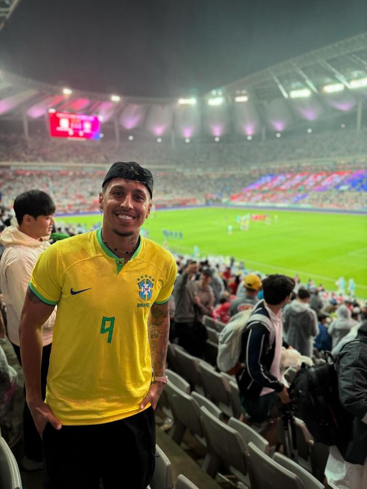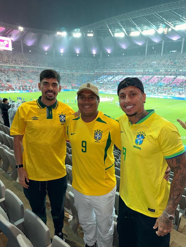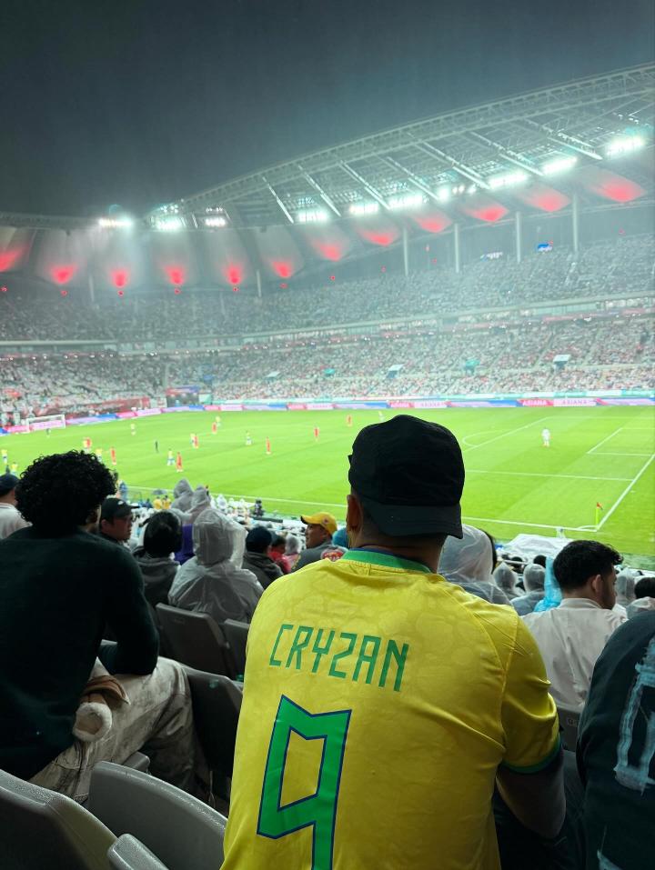 他身穿印有自己名字的巴西队9号球衣,现场为巴西队加油助威。