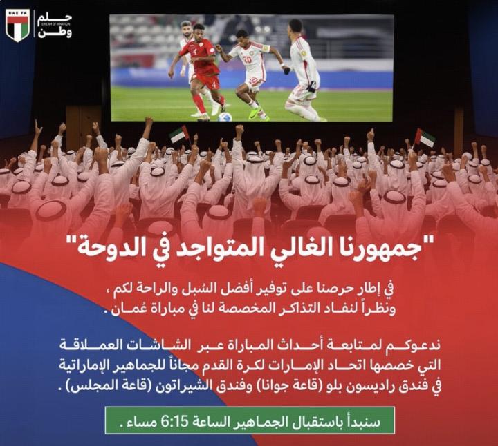 亲爱的球迷们,我们热切希望为您提供最好的方式和舒适的环境,并且由于分配给我们的阿曼比赛门票已经售罄。我们邀请您在阿联酋足球协会为阿联酋球迷免费提供的位于丽笙酒店和喜来登酒店的巨型屏幕上关注比赛动态。我们将于下午6:15(当地时间)开始接待公众。