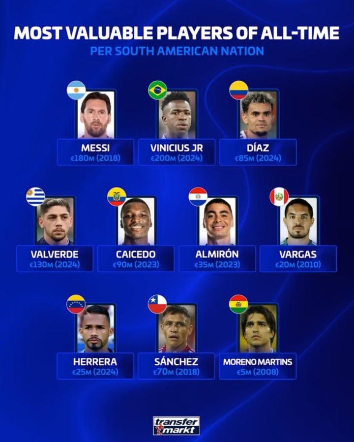 北京时间10月11日,德转统计出了南美各国球员历史的最高身价,2024年身价曾一度达到2亿欧元的维尼修斯领衔,2018年身价曾达到1.8亿欧元的梅西排名第二,2024年身价达到1.3亿欧元的费德里科-巴尔韦德排名第三。