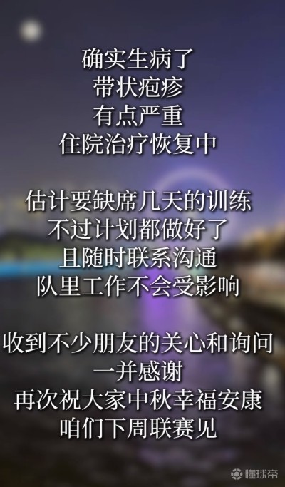 10月7日,天津津门虎主帅于根伟通过社交媒体账号透露,自己得了带状疱疹,有点严重,已经住院治疗恢复。