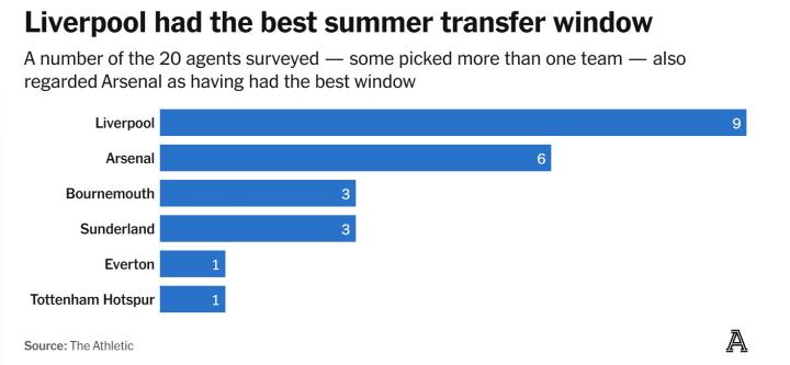 阿森纳实际上以六票位居第二。利物浦花费4.18亿英镑的采购狂潮(通过价值1.9亿英镑的球员销售抵消)为他们赢得了赞誉和榜首位置,尽管几位新援尚未产生化学反应。