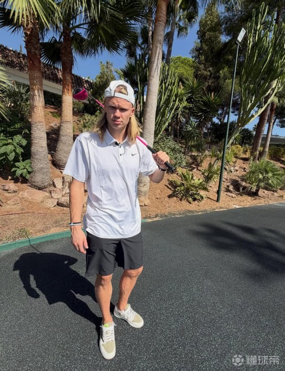 哈兰德在社交媒体上晒出了自己与父亲去打高尔夫的照片,并配文:“高尔夫!” 可以看到,他拿着一个粉红色的高尔夫球杆。