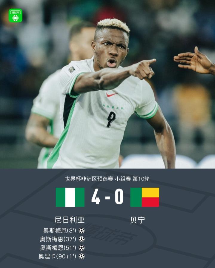 尼日利亚4-0送贝宁出局,补时锁定附加赛席位,奥斯梅恩戴帽