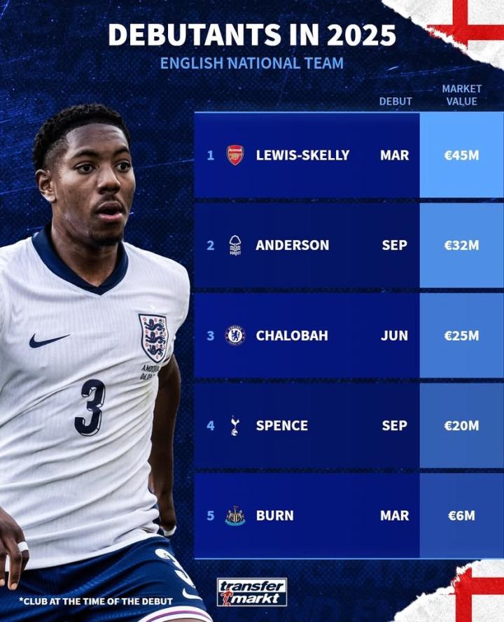 北京时间10月16日,德转列出了2025年完成英格兰成年代表队首秀的球员,其中包括了阿森纳的刘易斯-斯凯利、切尔西的查洛巴以及托特纳姆热刺的斯彭斯。