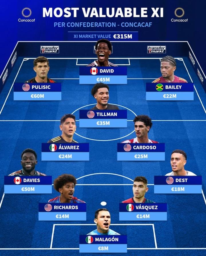 北京时间10月16日,德转列出了目前中北美洲及加勒比地区球员中身价最高的11人阵容,身价6000万欧元的普利希奇领衔,身价5000万欧元的阿方索-戴维斯和身价4500万欧元的乔纳森-戴维在列。