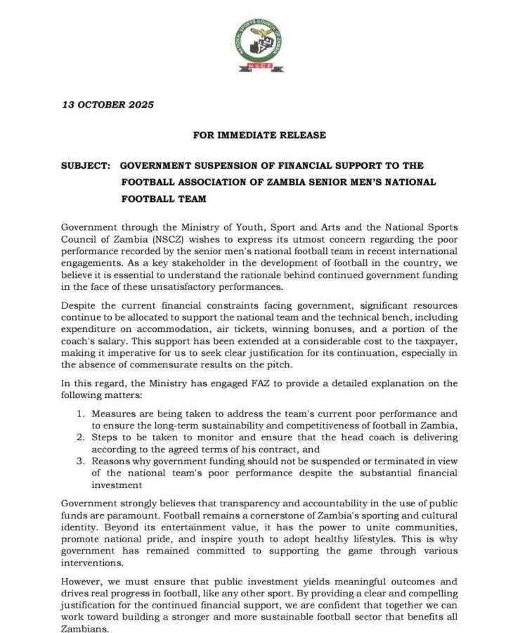 赞比亚政府通过青年、体育与艺术部以及赞比亚国家体育委员会(NSCZ)表示,对于国家男子成年队在近期国际比赛中所呈现的糟糕表现深感关切。作为该国足球发展的一方重要利益相关者,我们认为在面对这些令人不满的比赛成绩时,了解继续提供政府资助的理由是必要的。