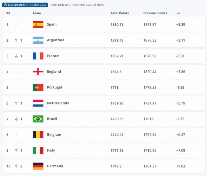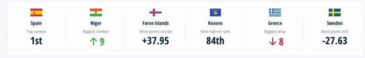 本期世界排名中,西班牙排名第一,尼日尔上升9位是涨幅最大的球队,法罗群岛由于近期表现+39.95分。希腊下降8位是降幅最大的球队,而瑞典则-27.63分。另外,科索沃排名世界第84创造了队史新高。