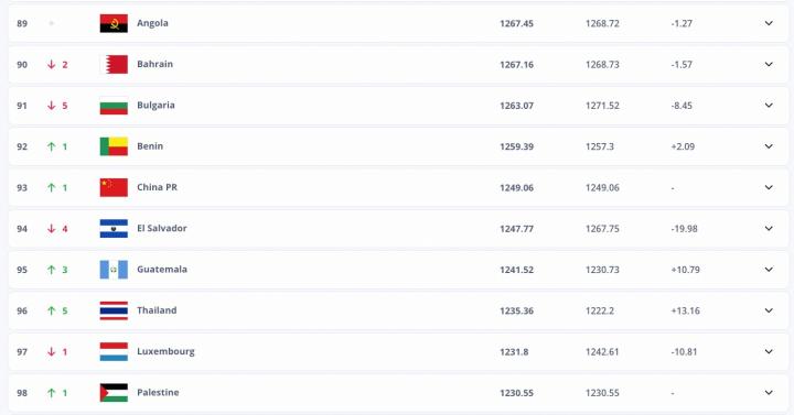 中国男足上升一名位列第93,位于贝宁和萨尔瓦多之间,在亚洲排名第14。泰国上升5位排名第96。