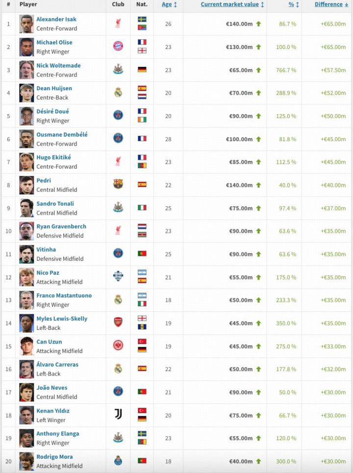 德国转会市场最新一期身价更新告一段落。据统计,从2025年年初至今,伊萨克与奥利塞是全球身价上涨最多的球员,身价均上涨6500万欧。其次是纽卡前锋沃尔特马德,身价上涨了5750万欧。金球奖得主登贝莱上涨4500万欧,身价重返1亿欧。