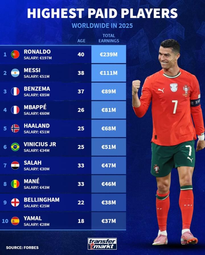 北京时间10月18日,德转依照福布斯的数据统计出了2025年世界足坛收入最高的10名球员,C罗、梅西、本泽马位列前三,姆巴佩则是欧洲足坛最高。