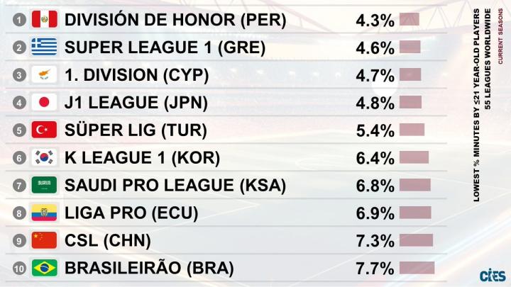 CIES Football Observatory的统计指出,秘鲁甲级联赛是全球55个联赛中U21球员出场时间占比最少的联赛,其比例仅为4.3%。日职联这一占比为4.8%,位列第四,K联赛6.4%位列第六,中超7.3%位列第九。