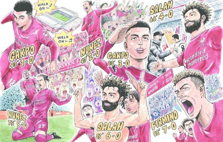 讲谈社揭幕了一幅特别的漫画作品,回顾利物浦队史对曼联的最大胜利,在2023年3月,利物浦在安菲尔德球场的英超比赛中以7-0的比分击败宿敌曼联。