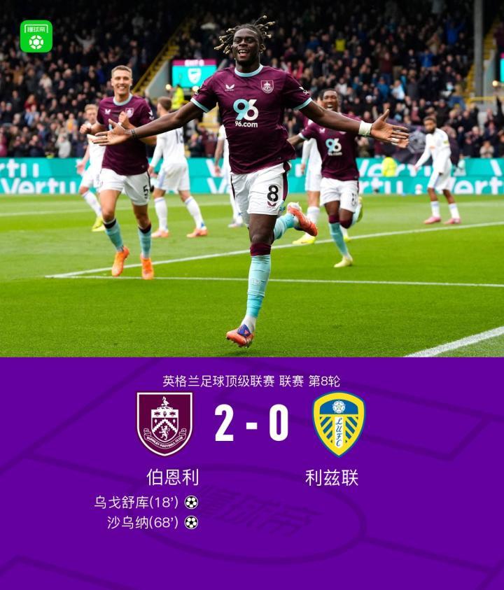 伯恩利2-0利兹联,乌戈舒库破门,沙乌纳锁定胜局