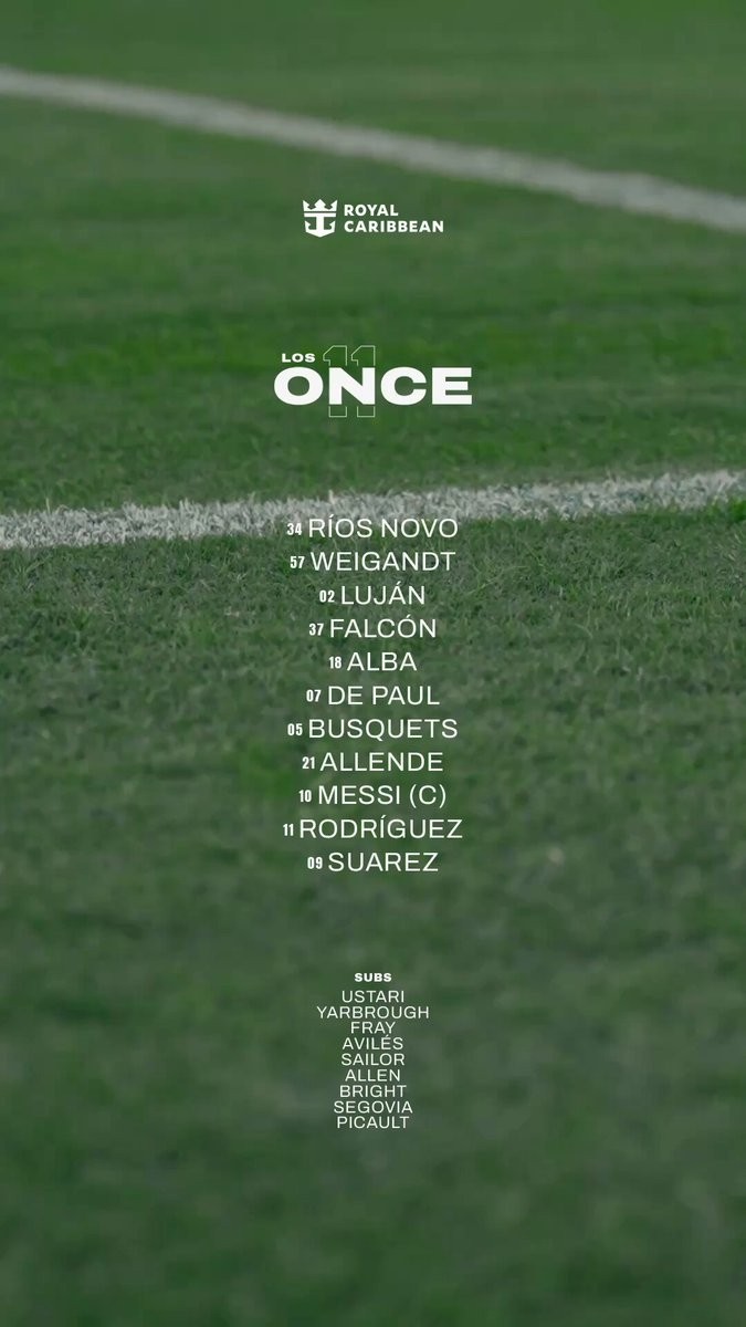 迈阿密国际首发:2-贡萨洛-卢汉、5-布斯克茨、7-德保罗、9-苏亚雷斯、10-梅西、11-巴尔塔萨尔-罗德里格斯、18-阿尔巴、21-阿连德、34-里奥斯、37-法尔孔、57-韦甘特
