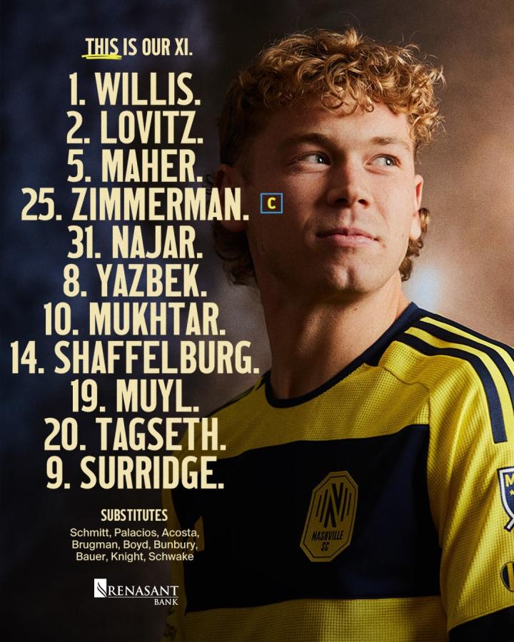 纳什维尔首发:1-威利斯、2-洛维茨、5-马厄、8-亚兹贝克、9-瑟里奇、10-穆赫塔尔、14-沙费尔伯格、19-亚历克斯-穆伊、20-塔格塞斯、25-齐默尔曼、31-纳哈尔