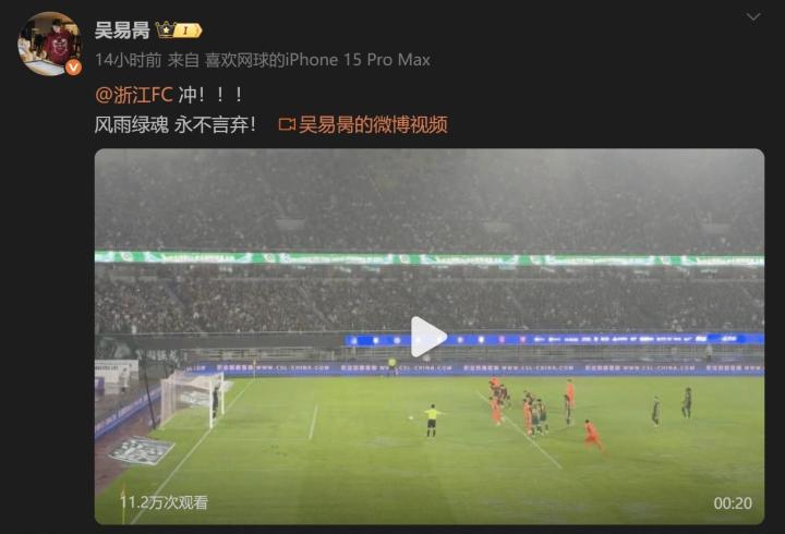 本场比赛,浙江队门将赵博扑出了山东泰山队卡扎伊什维利主罚的点球。吴易昺也录下了赵博扑救点球的过程,并在社交媒体上写道:“浙江FC 冲!!!风雨绿魂,永不言弃”。