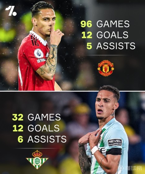 安东尼为皇家贝蒂斯各项赛事已出场32次,贡献了12粒进球和送出6次助攻,已直接参与18粒进球,超过了曼联生涯96场的数据。