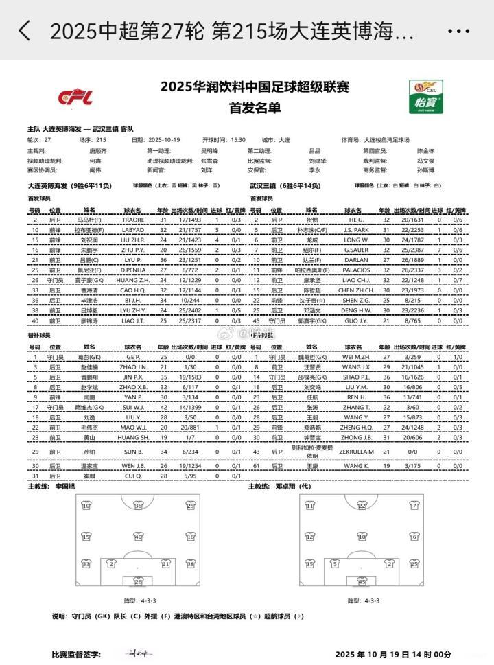 北京时间10月19日15:30,中超联赛第27轮,大连英博坐镇主场迎战武汉三镇,本场比赛主裁判是唐顺齐,VAR是何鑫,赛前双方公布首发: