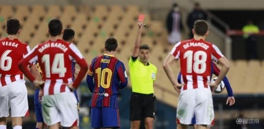 在2021年西班牙超级杯决赛中,曼萨诺直接红牌罚下梅西,就此凑齐了对巴萨传奇“MSN”三叉戟的罚下纪录。当时,梅西在与毕尔巴鄂竞技球员比利亚利夫雷的纠缠中手臂有推搡动作,被主裁判直接出示红牌。
