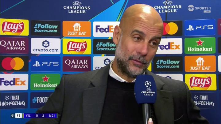 率队在欧冠联赛阶段第3轮客场2-0击败比利亚雷亚尔之后,曼城主教练瓜迪奥拉接受了来自TNT体育的采访。
